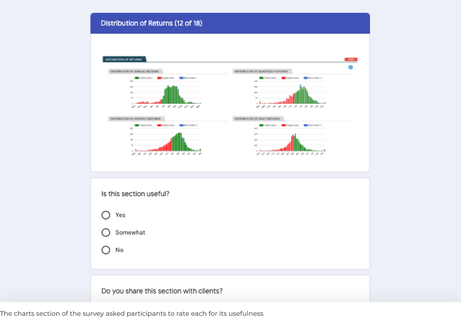 The survey had two main objectives: To understand what stories advisors were telling to their investors using Performance Analysis, and which charts they found most useful in this story telling. There was a multiple choice section to glean high level understanding, a section rating the usefulness of each of the 18 existing charts.