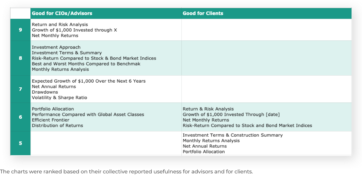 To interpret the results for the charts rankings in particular, I assigned a point system. A "yes" was 2 points, "maybe" 1 point, and "no" 0 points. I then added up the totals for each chart for both advisor usefulness and investor usefulness. From there, the results were clear. No charts were especially useful for investors, and the ones that were were centered around returns.